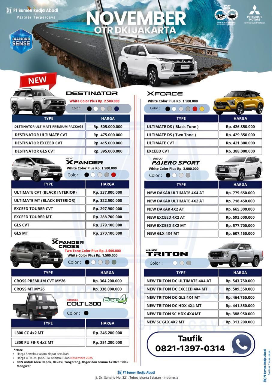 • Harga ini belum termasuk diskon atau promo khusus Destinator lainnya yang mungkin saya tawarkan secara personal sebagai sales Mitsubishi Jakarta Selatan.